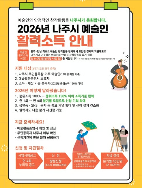예술활동은 멈추고 싶지 않은데, 생활비 걱정이 앞선다면? 나주시에 거주 중인 예술인을 위한 특별한 지원책이 시작됐습니다. 연 최대 180만 원, 분기마다 신청 기회가 있는 ‘2026 예술인 활력소득 지원금’으로 창작의 숨통을 틔워보세요.
