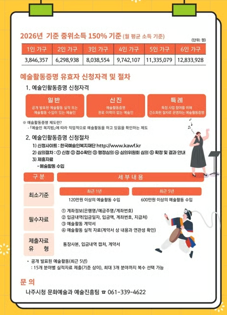 | 신청 대상 | 나주 1년 이상 거주 예술인, 중위소득 150% 이하 |